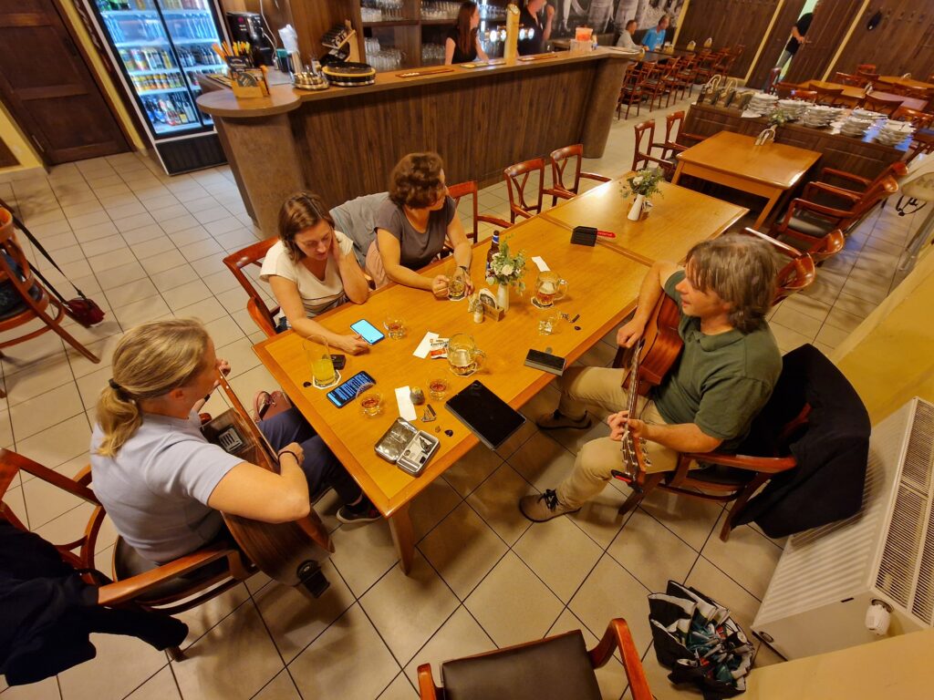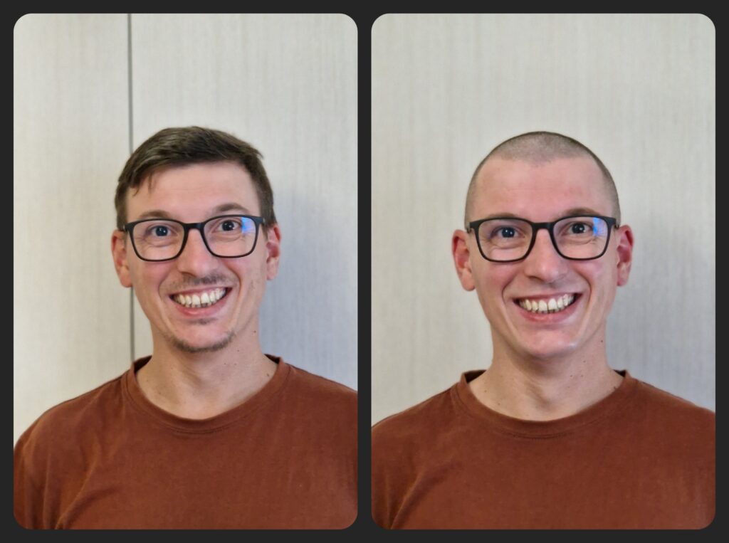 No a je pozdní odpoledne. Jsme zpátky z koncertu, kterej si s sebou ponesu po celej výcvik (díky, Jarreti!) a podařilo se pořídit jak tepláky, tak mašinku. A tak nezbývá, než udělat foto před a po ostříhání. Kátě předávám telefon na fotku před a pak už se toho holky proaktivně chápají. Začíná Káťa s levou půlkou hlavy. U toho ze mě dělá dědu/hejmu a průběžně mě zbavuje zbytečného porostu. Zuzajda dokonává dílo a holí mi pravou půlku hlavy. Luca u toho mlčky stojí a má v ruce telefon. Nakonec dolaďujeme společnými silami detaily, já se po dvou týdnech zase holím a tadá, blbeček je na světě.